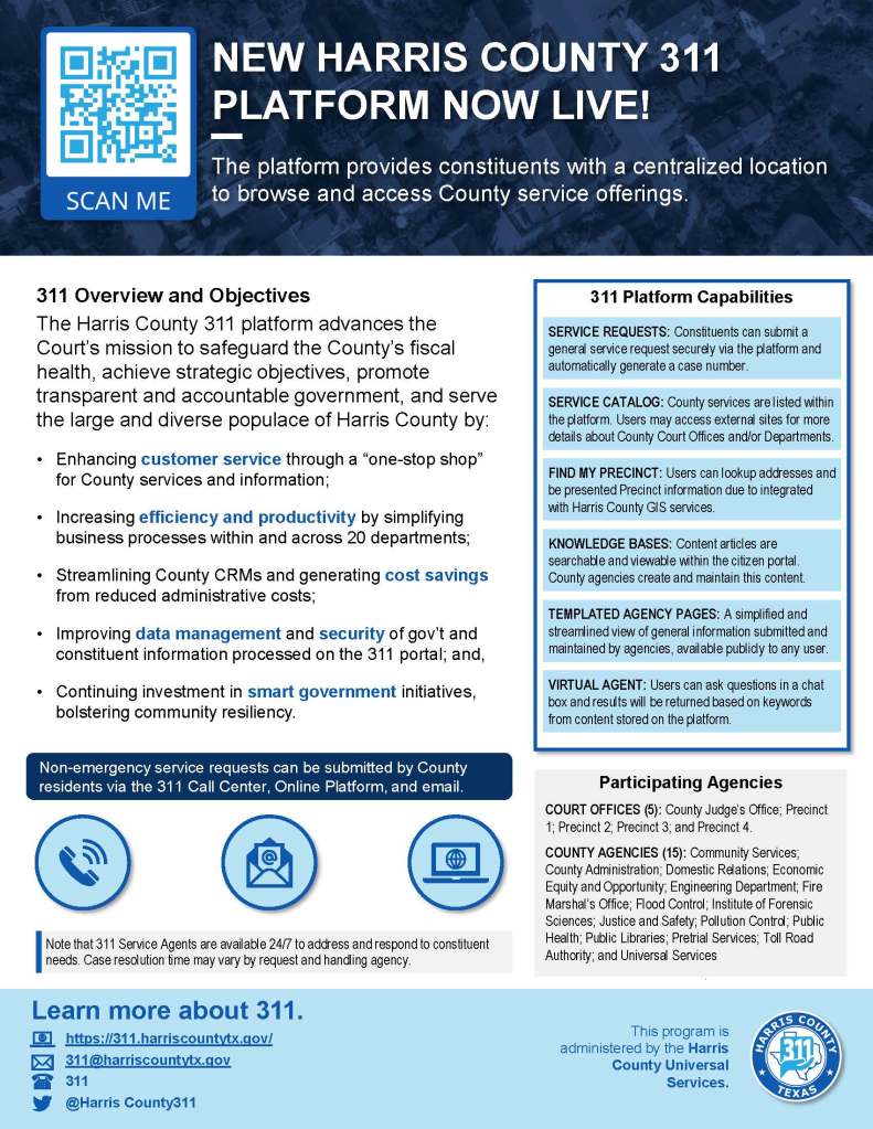 Harris County 311 One-Pager Posted byKatherine MestousisFebruary 24, 2023Posted inAll-Inclusive Related Published by Katherine Mestousis Visit me on LinkedIn at https://www.linkedin.com/in/kmestousis/. View more posts