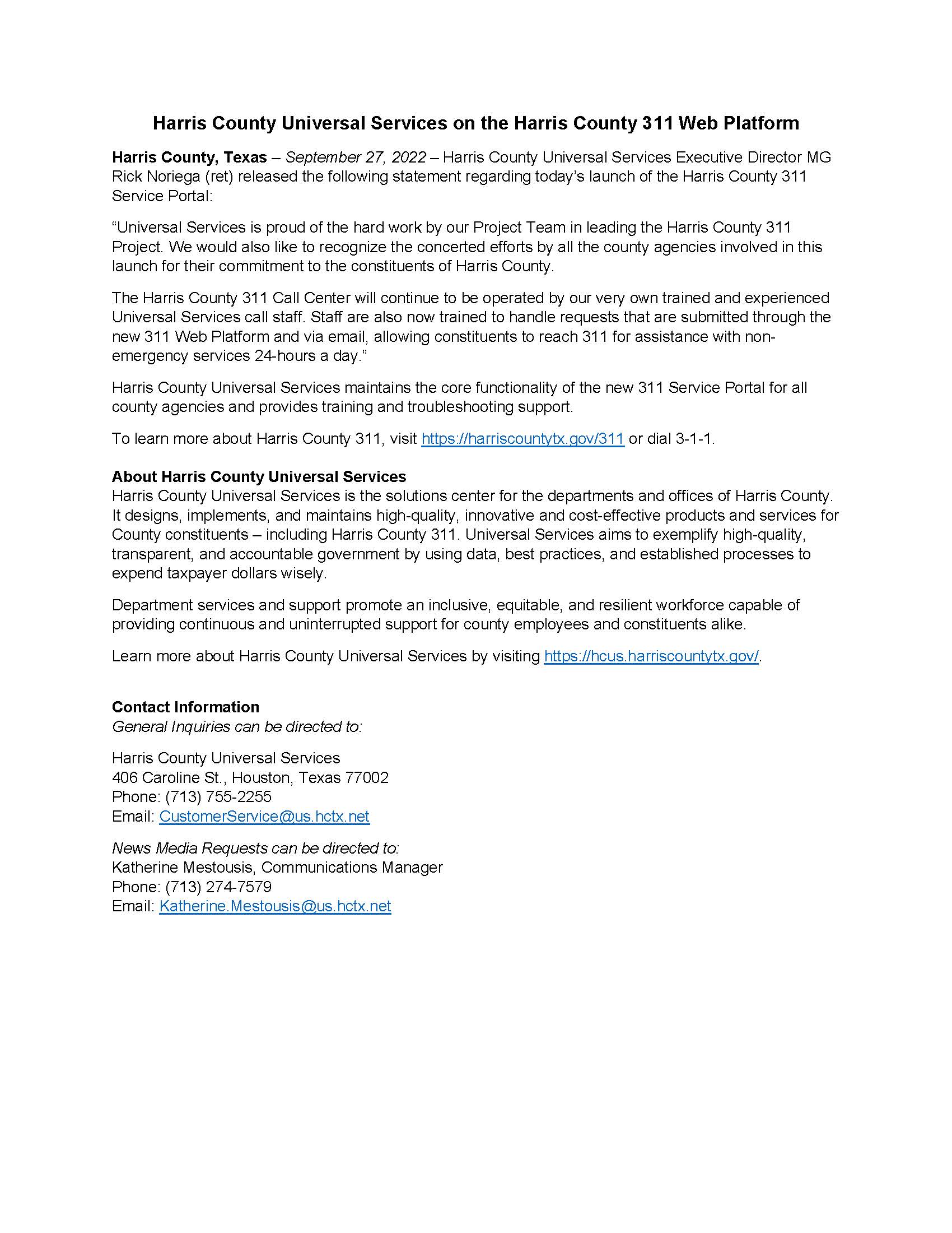 Harris County 311 Press Release Posted byKatherine MestousisFebruary 24, 2023February 24, 2023Posted inAll-Inclusive Related Published by Katherine Mestousis Visit me on LinkedIn at https://www.linkedin.com/in/kmestousis/. View more posts